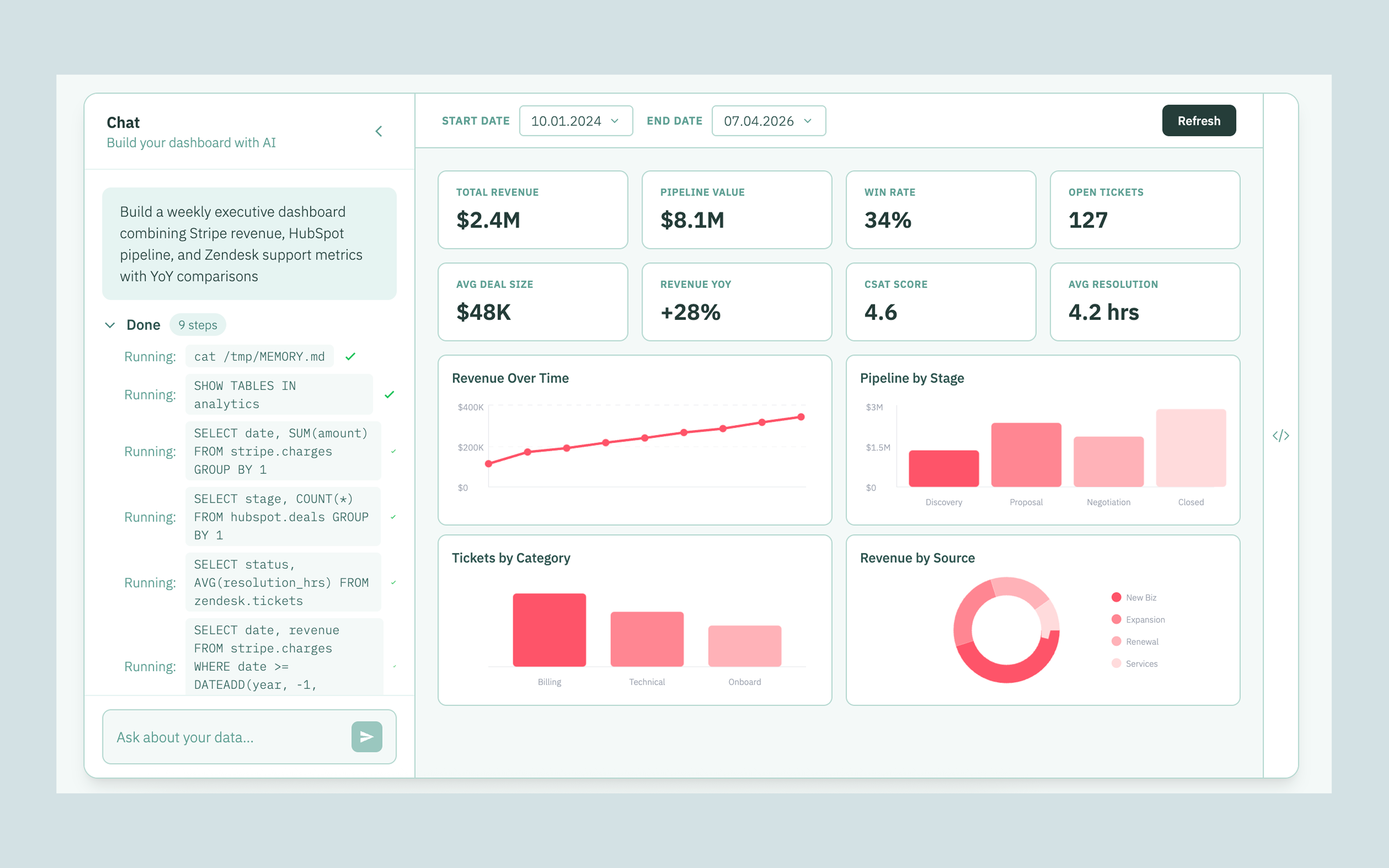 And increasingly, even those surviving dashboards are generated from a prompt rather than hand-built. Tools like Bruin's AI dashboards let a user describe the dashboard they want ("show me a weekly growth overview with signups, activations, revenue, and churn, filterable by plan") and the platform composes it. If it needs edits, you edit by talking, not by dragging chart tiles around.